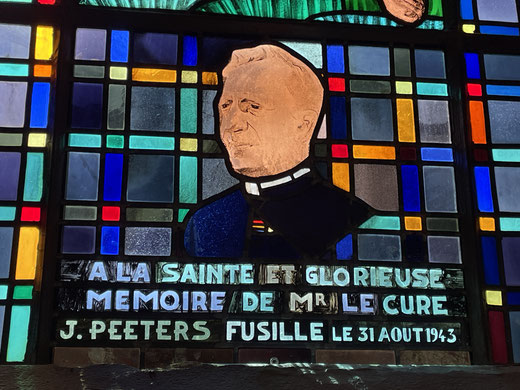 Le premier vitrail a été réalisé en hommage au curé PEETERS. Nous ne savons pas grand chose de cet homme qui fut résistant pendant la guerre 1940-45 avant d'être fusillé par les Allemands.