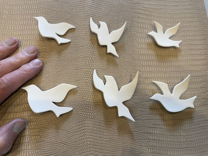 L'artiste, Bernard CHAMPON, a imaginé des mini colombes en porcelaine de Limoges qui sont de trois modèles montés en magnets ou en broches. Ce sera un magnifique souvenir sur la porte de votre frigo ou au revers de votre pull.